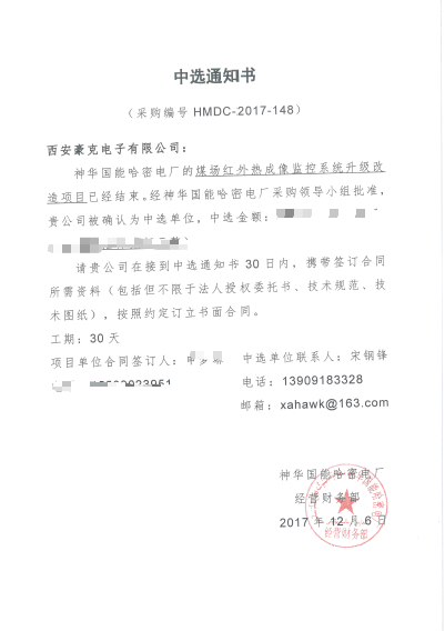 半年来通过和神华国能哈密电厂的技术的详细对接,和去现场进行实际勘察 再到后续的方案撰写、评估、方案确定、招投标现在终于尘埃落定,我们豪克火情预警系统HK-HSD中选!